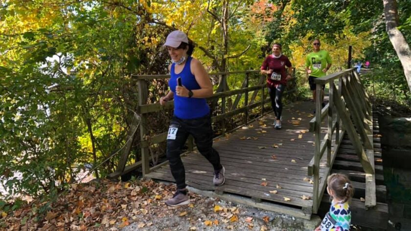 In order to keep everyone as safe and physically distant as possible the runners started in small waves of 4-6 people every 15 minutes from 9:30 a.m. until 11:00 a.m. The trail itself was wide and flat allowing for plenty of space for everyone running. Not only was the trail beautiful (just take a look at the pictures with foliage starting to peak), the weather was also perfect. High 50s to high 60s as the day went on with lots of sunshine. We could not have had nicer weather.